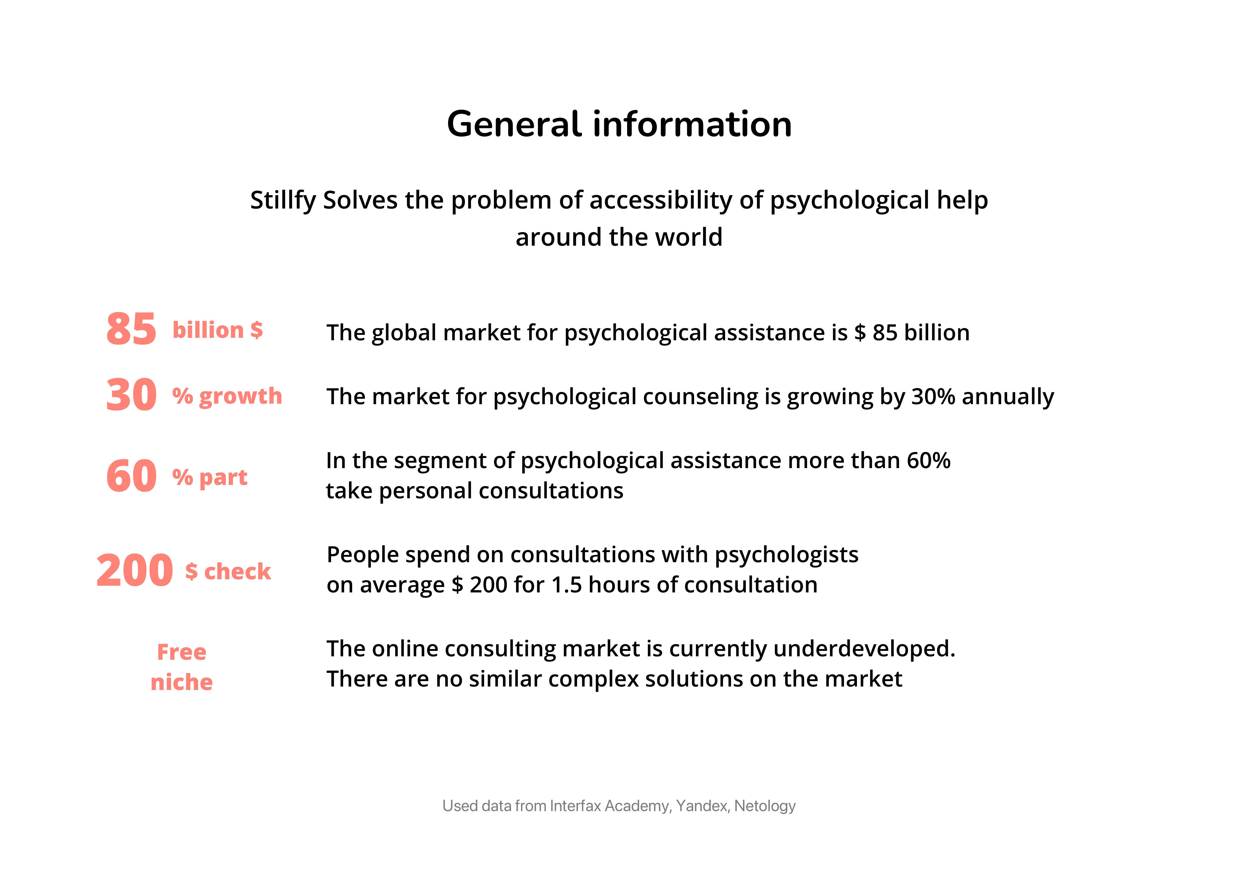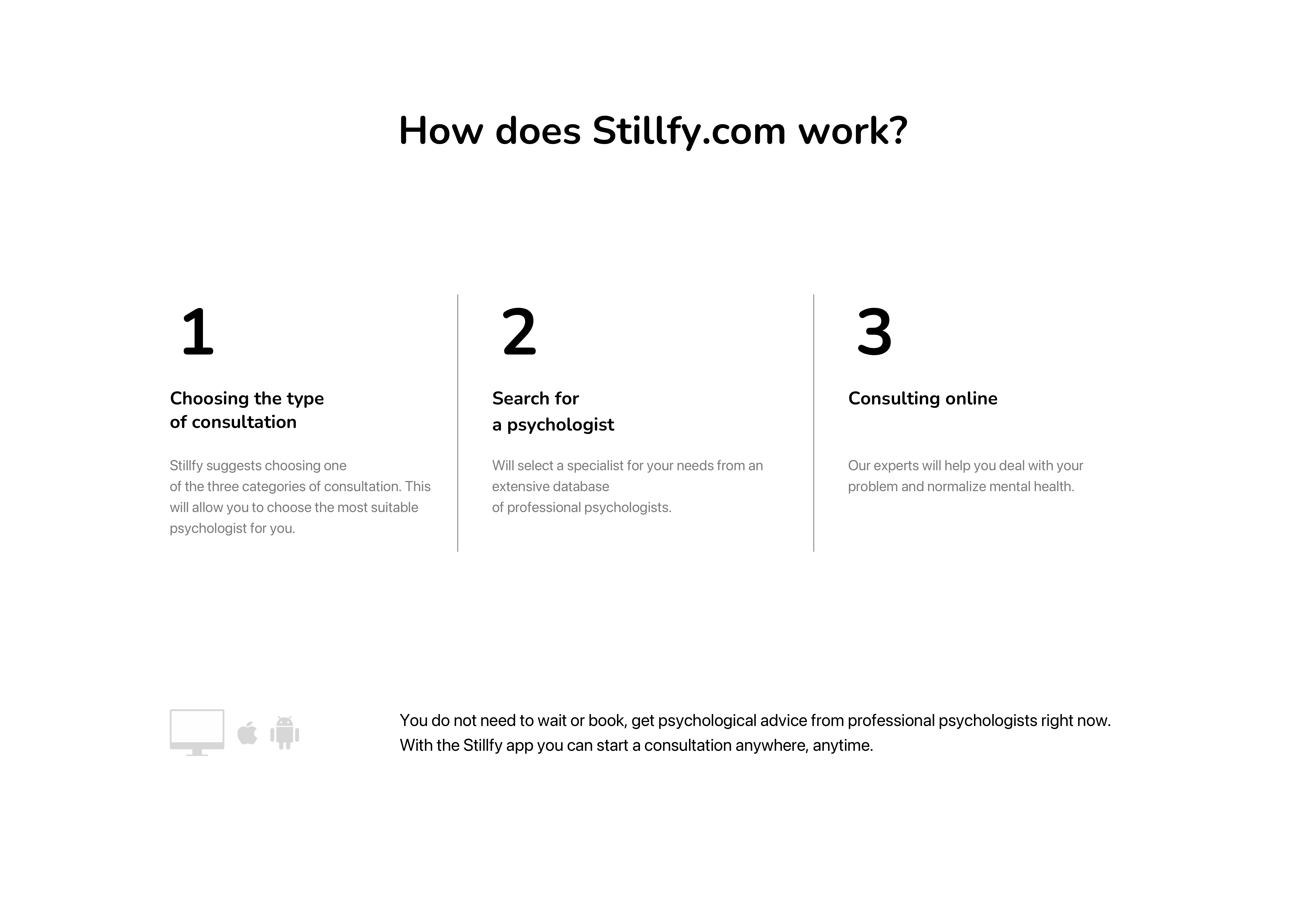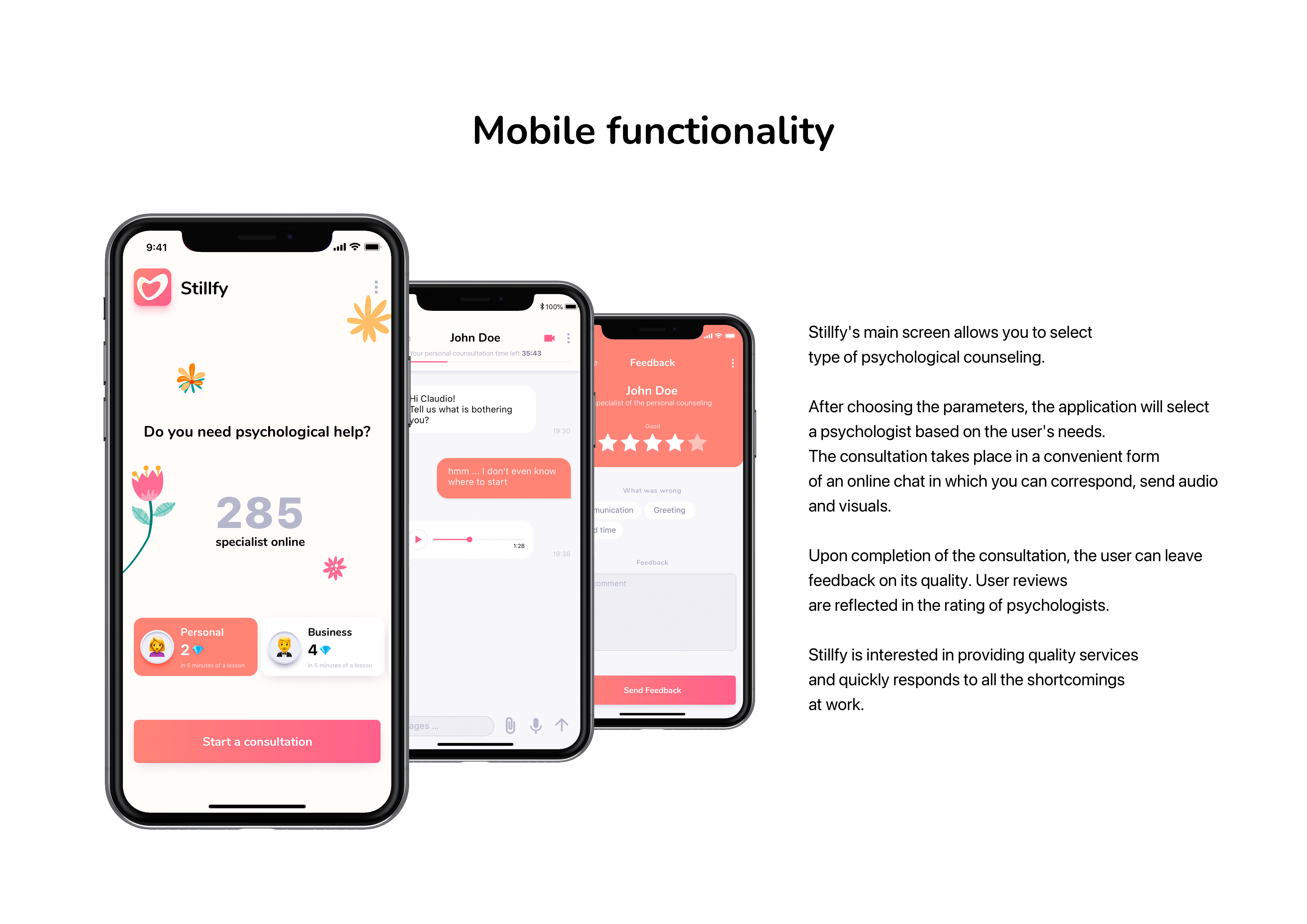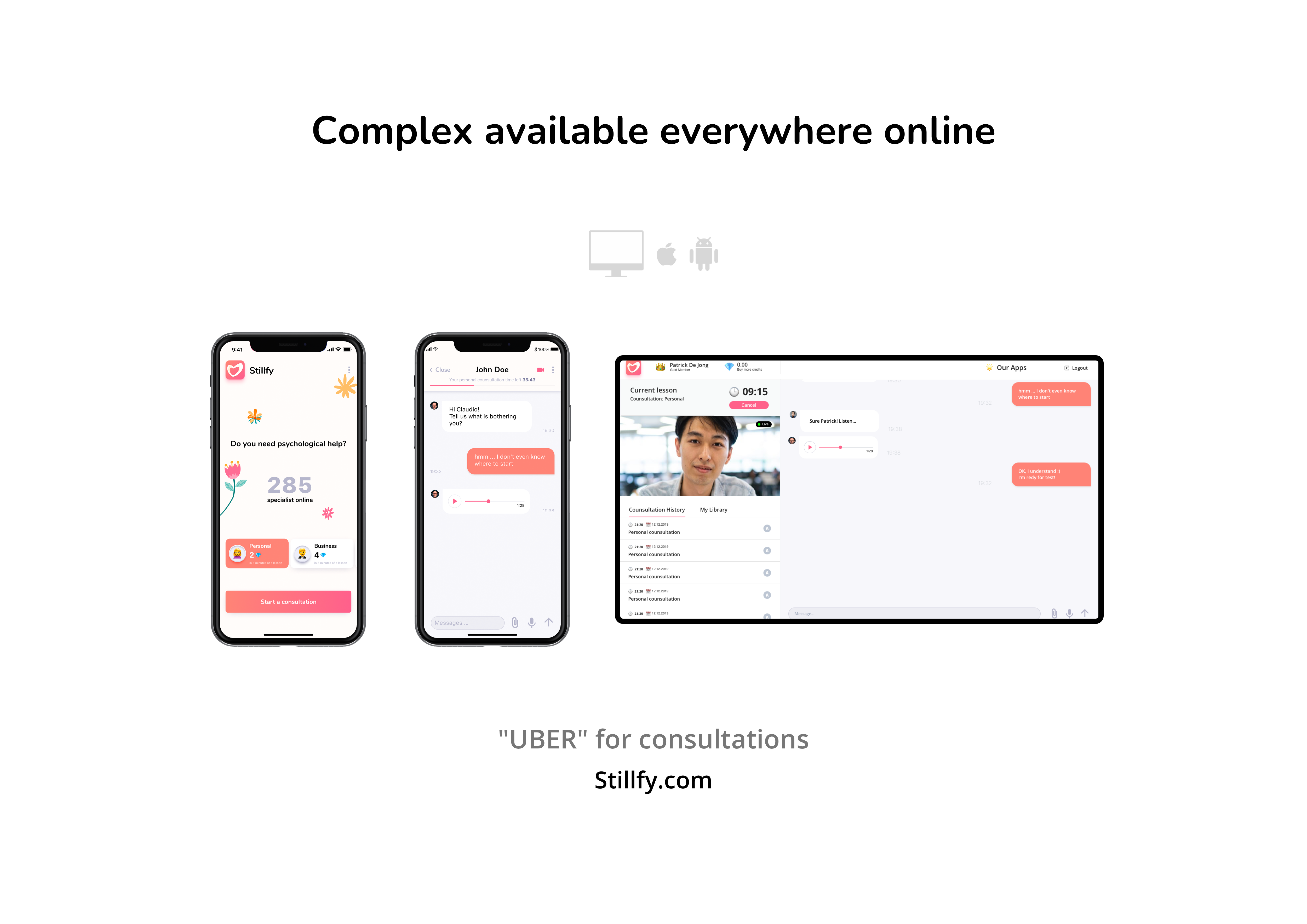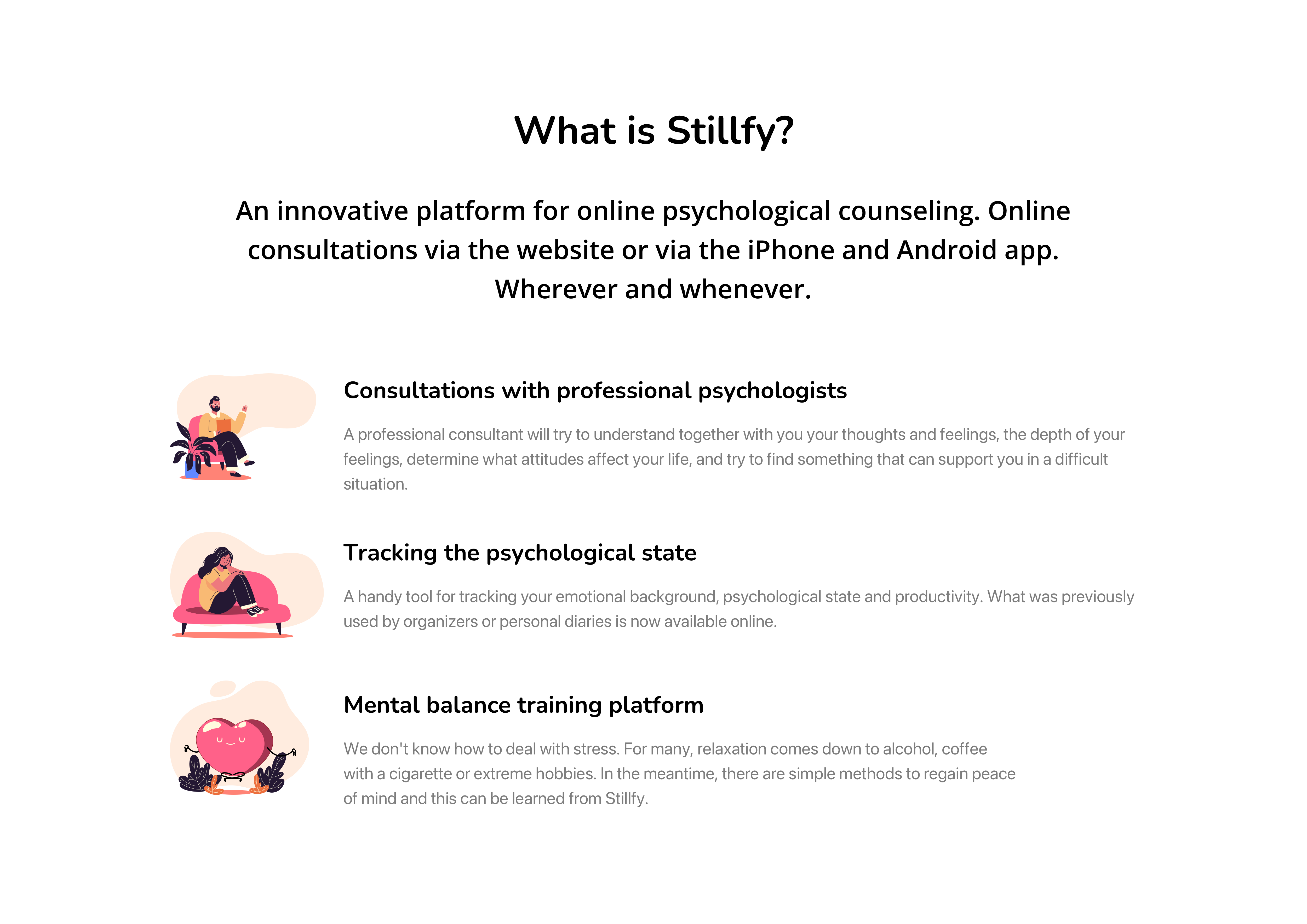 Stilly es una plataforma innovadora diseñada para hacer que la ayuda psicológica sea accesible para todos. En el mundo de hoy, donde el estrés y la ansiedad son una parte integral de la vida, la demanda de apoyo psicológico aumenta diariamente. Stilly tiene como objetivo abordar el problema de accesibilidad de dicha ayuda proporcionando a los usuarios una manera conveniente y efectiva de recibir consultas psicológicas en línea.