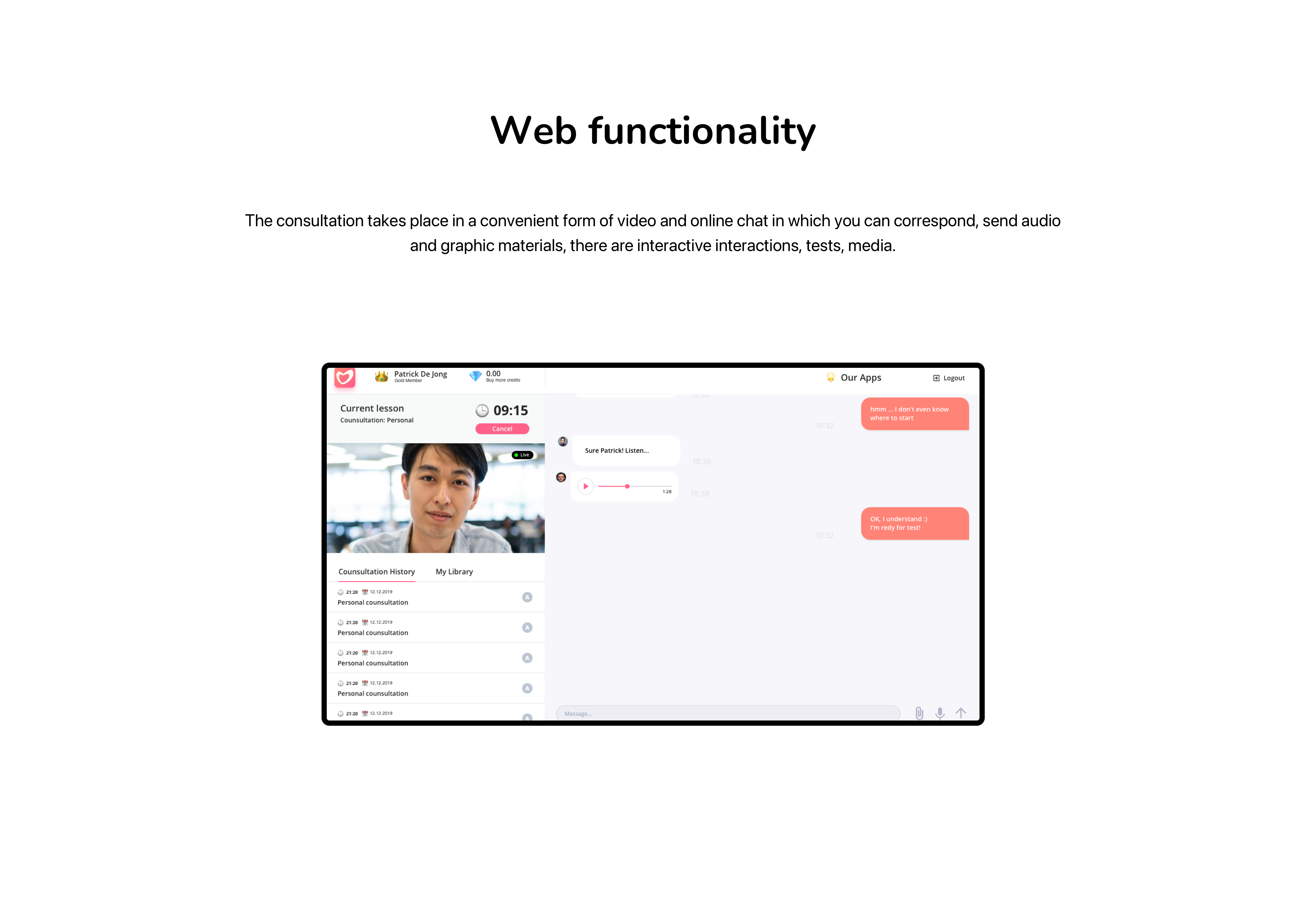 - Realización de Consultas: Las consultas se llevan a cabo a través de video y chat en línea, donde los usuarios pueden intercambiar mensajes, materiales de audio y gráficos.